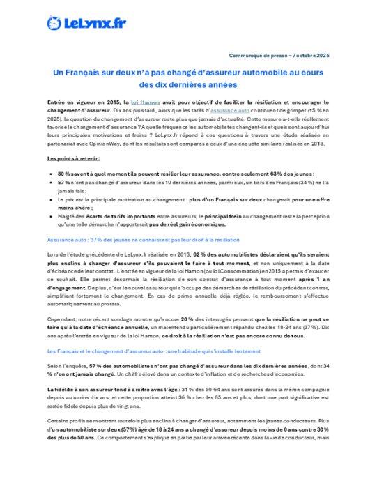 Entrée en vigueur en 2015, la loi Hamon avait pour objectif de faciliter la résiliation et encourager le changement d’assureur. Dix ans plus tard, alors que les tarifs d’assurance auto continuent de grimper (+5 % en 2025), la question du changement d’assureur reste plus que jamais d’actualité. Cette mesure a-t-elle réellement favorisé le changement d’assurance ? A quelle fréquence les automobilistes changent-ils et quels sont aujourd’hui leurs principales motivations et freins ? LeLynx.fr répond à ces questions à travers une étude réalisée en partenariat avec OpinionWay, dont les résultats sont comparés à ceux d’une enquête similaire réalisée en 2013.