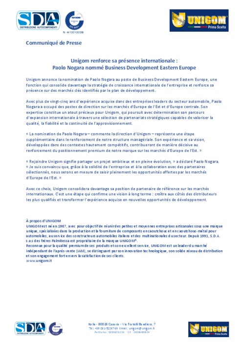 Unigom annonce la nomination de Paolo Nogara au poste de Business Development Eastern Europe, une fonction qui consolide davantage la stratégie de croissance internationale de l’entreprise et renforce sa présence sur des marchés clés identifiés par le plan de développement.