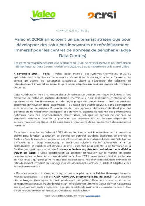Valeo, leader mondial des systèmes thermiques, et 2CRSi, spécialiste dans la fabrication de serveurs et de solutions de stockage haute performance, ont conclu un accord de partenariat stratégique visant à développer des solutions de refroidissement immersif de nouvelle génération adaptées aux environnements informatiques de pointe.