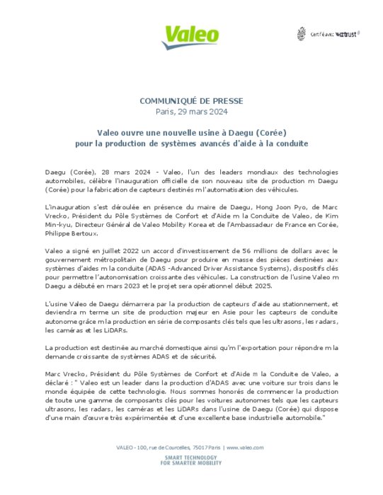 L'inauguration s'est déroulée en présence du maire de Daegu, Hong Joon Pyo, de Marc Vrecko, Président du Pôle Systèmes de Confort et d'Aide m la Conduite de Valeo, de Kim Min-kyu, Directeur Général de Valeo Mobility Korea et de l'Ambassadeur de France en Corée, Philippe Bertoux.