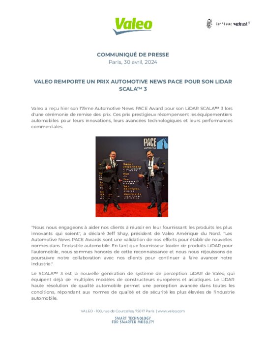 Valeo a reçu hier son 17ème Automotive News PACE Award pour son LiDAR SCALA 3 lors d'une cérémonie de remise des prix. Ces prix prestigieux récompensent les équipementiers automobiles pour leurs innovations, leurs avancées technologiques et leurs performances commerciales.