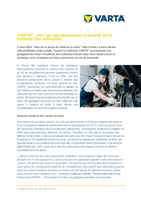 Face à la peur de la panne en hiver, l'expert en batteries VARTA recommande aux garagistes de tester la batterie des véhicules entrant dans leurs ateliers pour la recharger ou la remplacer de façon préventive en cas de nécessité. Ce réflexe leur permet de saisir de nouvelles opportunités commerciales et de soigner la satisfaction de leurs clients en leur évitant la panne et l'immobilisation de leur voiture.