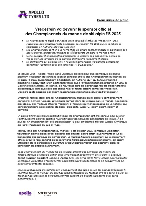Apollo Tyres a signé un nouvel accord pour que sa marque de pneus premium Vredestein devienne le sponsor principal officiel des Championnats du monde de ski alpin FIS 2025, qui se tiendront à Saalbach, en Autriche, du 4 au 16 février l'année prochaine. S'appuyant sur un partenariat réussi avec l'événement phare organisé en 2023 à Courchevel et Méribel, en France, ce nouvel accord de parrainage renforcera la notoriété de la marque, ainsi que celle des pneus hiver et toutes saisons primés de Vredestein.