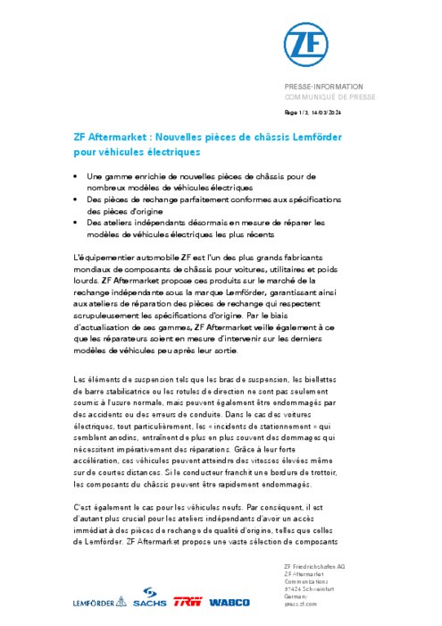 L'équipementier automobile ZF est l'un des plus grands fabricants mondiaux de composants de châssis pour voitures, utilitaires et poids lourds. ZF Aftermarket propose ces produits sur le marché de la rechange indépendante sous la marque Lemförder, garantissant ainsi aux ateliers de réparation des pièces de rechange qui respectent scrupuleusement les spécifications d'origine. Par le biais d’actualisation de ses gammes, ZF Aftermarket veille également à ce que les réparateurs soient en mesure d’intervenir sur les derniers modèles de véhicules peu après leur sortie.