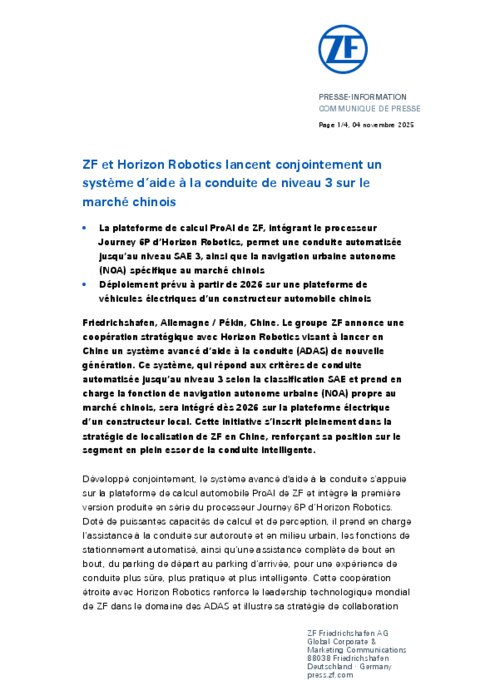 Le groupe ZF annonce une coopération stratégique avec Horizon Robotics visant à lancer en Chine un système avancé d’aide à la conduite (ADAS) de nouvelle génération. Ce système, qui répond aux critères de conduite automatisée jusqu’au niveau 3 selon la classification SAE et prend en charge la fonction de navigation autonome urbaine (NOA) propre au marché chinois, sera intégré dès 2026 sur la plateforme électrique d’un constructeur local.
