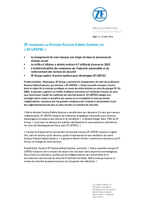 ZF Group a annoncé le changement de nom de sa division Passive Safety Systems, qui devient « ZF LIFETEC ». Cette nouvelle marque s'inscrit dans le cadre de la scission juridique en cours de cette division au sein du groupe ZF. En