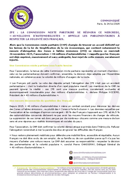 Alors que la Commission mixte paritaire (CMP) chargée de trouver un accord définitif sur les termes de la loi de Simplification de la vie économique, qui contient notamment la mesure d’abrogation des Zones à faibles émissions (ZFE) se réunira ce mercredi 26novembre2025, l’association « 40 millions d’automobilistes » rappelle que les Français ont déjà exprimé, massivement et sans ambiguïté, leur rejet de cette mesure socialement injuste.
