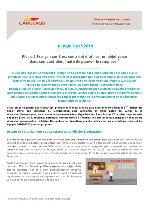 Carglass lance la 3ème édition des Repair Days : une campagne de sensibilisation pour convaincre le grand public des vertus de la réparation (économiques, sociétales et environnementales). Organisée du 5 au 17 octobre, cette tournée nationale (Paris, Lille, Toulouse, Bordeaux, Nantes) mettra à l’honneur les acteurs locaux engagés en matière de réparation responsable et solidaire.