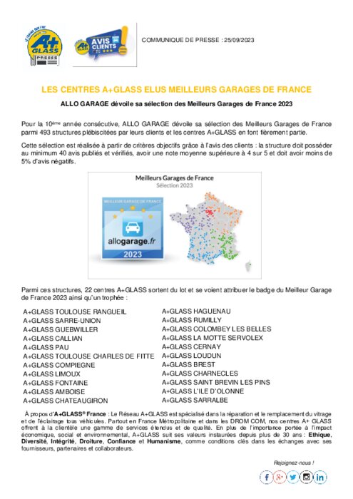 Pour la 10ème année consécutive, Allogarage dévoile sa sélection des Meilleurs Garages de France parmi 493 structures plébiscitées par leurs clients et les centres A+GLASS en font fièrement partie. Cette sélection est réalisée à partir de critères objectifs grâce à l’avis des clients : la structure doit posséder au minimum 40 avis publiés et vérifiés, avoir une note moyenne supérieure à 4 sur 5 et doit avoir moins de 5 % d’avis négatifs.