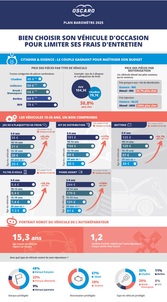 À l’heure où les automobilistes cherchent à optimiser leur budget auto et où l’inflation automobile incite de nombreux Français à se tourner vers l’entretien à moindre coût, Oscaro, plateforme leader de la vente de pièces détachées en ligne publie la première édition de son baromètre annuel des frais d’entretien des véhicules. L’objectif est d’analyser précisément le coût des pièces en fonction du cycle de vie du véhicule, de sa motorisation et de son type de carrosserie.